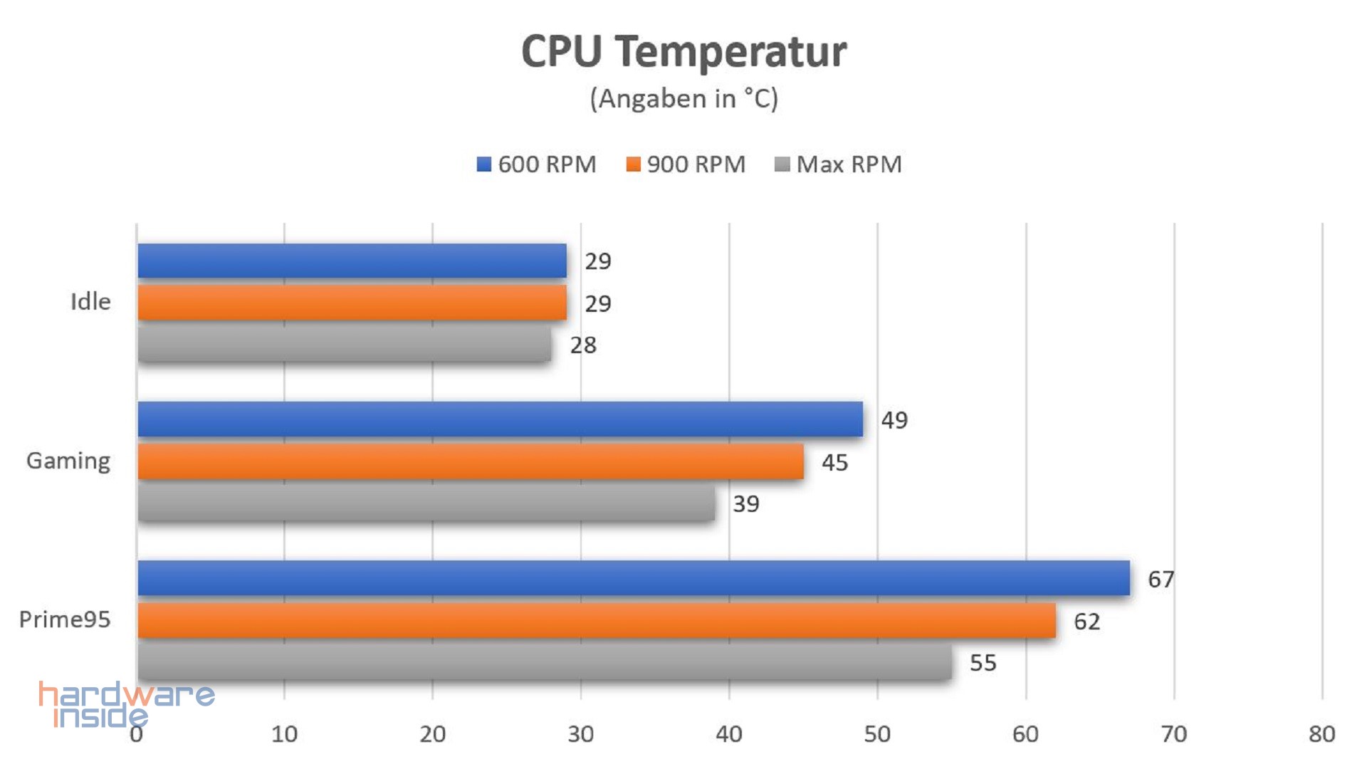 Für unsere Tests nutzen wir drei verschiedene Szenarien. Wir testen die Alpenföhn Gletscherwasser 240 im Idle-Mode, beim Gaming und lasten die CPU für 15 Minuten mit Prime95 aus (Die Umgebungstemperatur lag während der Tests bei 22 °C). Die von uns ermittelten Testwerte dienen als Beispiel und beziehen sich auf unser Testsystem, bei einem anderen System können die Werte variieren. Wie anhand des Diagramms zu sehen ist, kann die Alpenföhn Gletscherwasser 240 unser System bei angenehmen Temperaturen halten. Die Lüfter sind während des Tests bei voller Drehzahl deutlich wahrzunehmen, wo hingegen die Pumpe nur bei geöffnetem Gehäuse leicht wahrnehmbar läuft. Werden die Lüfter bei 900 U/min betrieben, hat man ein angenehm leises System.