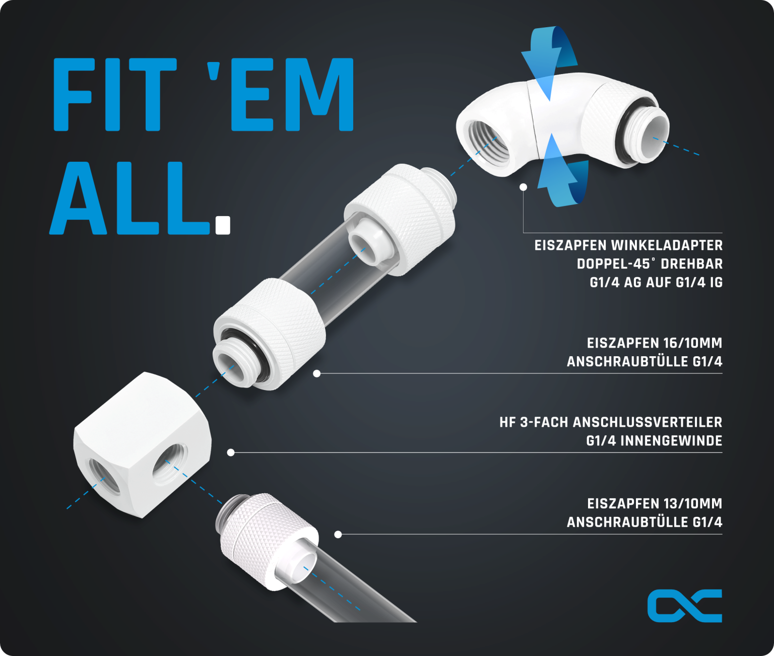 Die weißen Alphacool Eiszapfen 13/10mm Anschraubtülle G1/4 als auch Alphacool Eiszapfen 16/10mm Anschraubtülle G1/4 werden als Single und Sixpack angeboten und sind, wie auch Alphacool Eiszapfen Winkeladapter Doppel-45° drehbar G1/4 AG auf G1/4 IG, Alphacool Eiszapfen Kugelhahn 2 x G1/4 und Alphacool HF 3-Fach Anschlussverteiler G1/4 Innengewinde ab sofort im Onlineshop erhältlich.