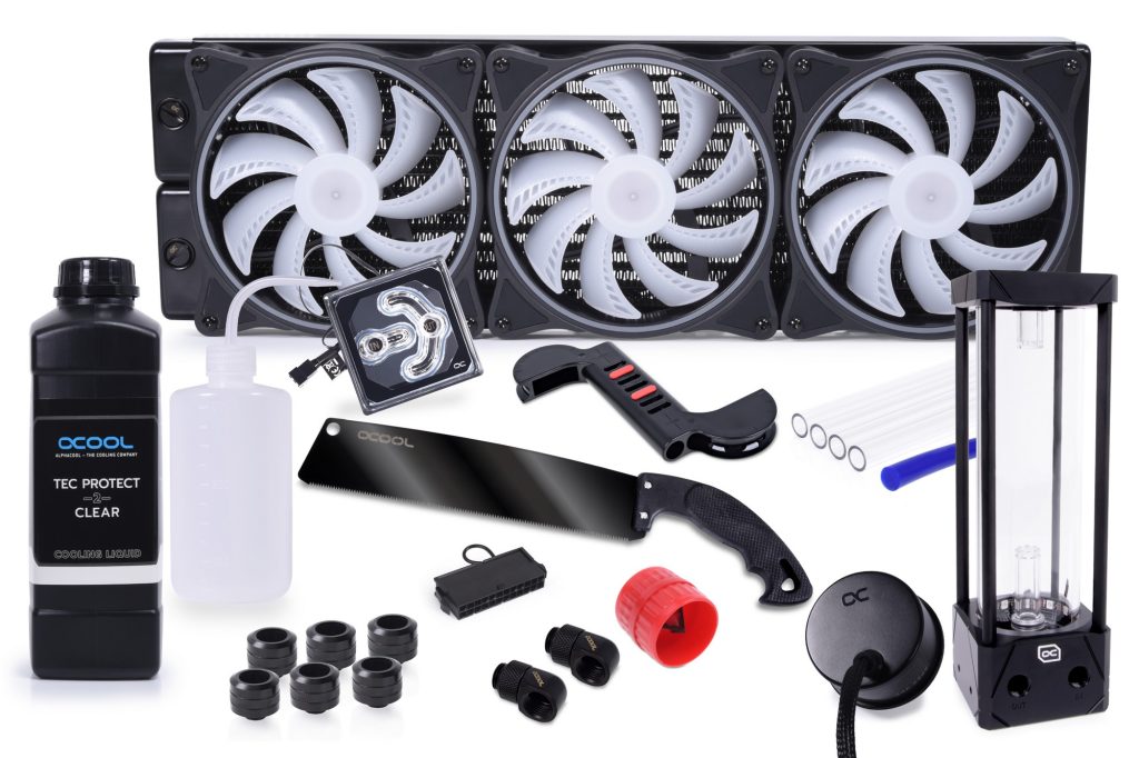 Das Zubehörpaket umfasst außerdem wichtige Hilfsmittel wie Befüllhilfe, ATX 24-Pin Jumper und SubZero Wärmeleitpaste. Somit kann mit dem Aufbau des Custom-Loops „out-of-the-box“ sofort begonnen werden.