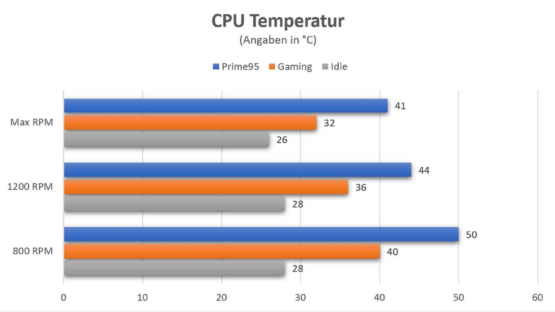 Da wir auch wissen möchten, wie sich die Alphacool Aurora 240 CPU – Digital RGB in der Praxis schlägt, machen wir ein paar Belastungstests. Dazu schauen wir uns zuerst die Werte im Idle an. Als nächstes testen wir die Temperaturen bei ein paar Runden Star Wars Battlegrounds II. Als letzten Test lassen wir 20 Minuten lang Prime95 laufen und lasten damit die CPU ordentlich aus. Die neuen Alphacool Aurora Lux Pro Lüfter machen hier einen sehr guten Eindruck. Bei 800 RPM sind sie im geschlossenen Gehäuse nicht zu hören, also ist auch ein Silent-Betrieb kein Problem. Selbst bei maximaler Drehzahl sind sie zwar hörbar aber zu keiner Zeit haben wir das Laufgeräusch als störend empfunden. Auch die Pumpe überzeugt uns, denn sie ist zu keiner Zeit aus dem geschlossenen Gehäuse heraus zu hören. Die Werte haben wir für euch auf dem folgenden Balkendiagramm zusammengefasst. Die Tests wurden bei einer Umgebungstemperatur von ca. 21 °C durchgeführt.