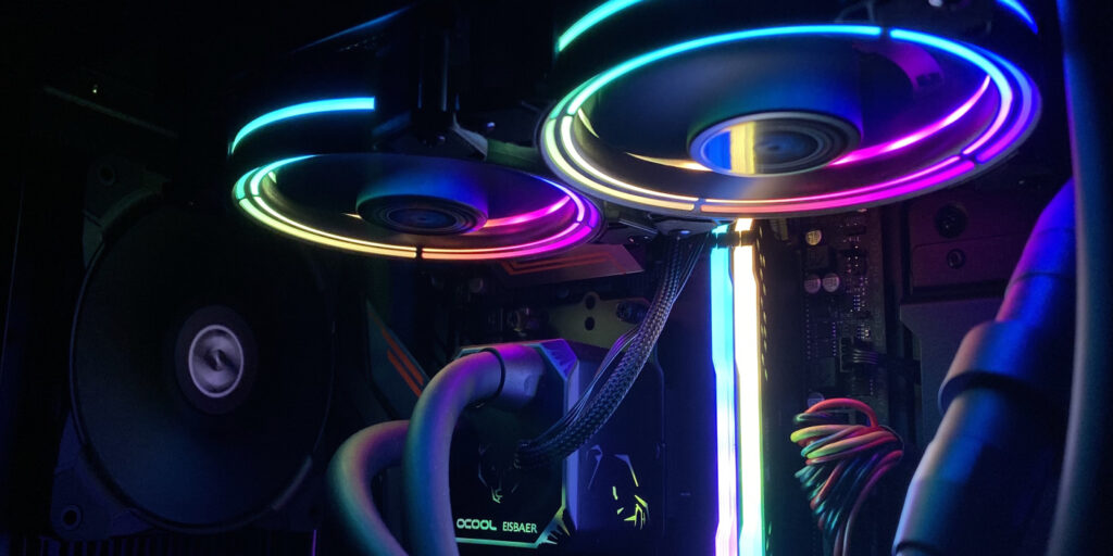 Um die Eisbaer Aurora 240 CPU – Digital RGB in unser System einbauen zu können, müssen zunächst ein paar kleine Vorarbeiten gemacht werden. Dafür montieren wir die beiden mitgelieferten Lüfter an die Unterseite des Radiators. Danach setzen wir die, für den Sockel passende, Klammer in die dazugehörige Halterung am Pumpen-AGGB-Gehäuse ein. Im nächsten Schritt bringen wir eine dünne Schicht Wärmeleitpaste auf die CPU auf. Danach schrauben wir den Radiator in den Deckel und dann das Pumpen-AGGB-Gehäuse mit der Backplate am Motherboard fest. Zuletzt schließen wir alle zugehörigen Anschlüsse an. Mit der wirklich gut beschriebenen Bedienungsanleitung ist der Einbau schnell und einfach erledigt.