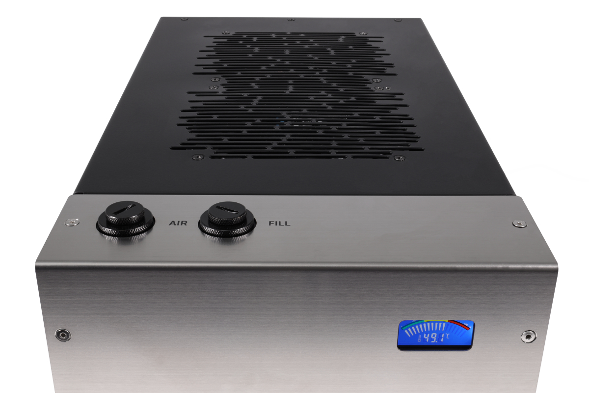 Das kompakte Design des Orbiter 360 TS ist schlicht gehalten. Er verfügt nicht nur über eine beleuchtete, farbige Temperaturanzeige, sondern auch über zwei eingelassene Griffe, die das Anheben oder auch den Transport erleichtern. Auf der Füllstandsanzeige auf der Vorderseite ist es möglich zu sehen, wie viel Kühlflüssigkeit sich im Kühlsystem befindet. Dank des Fillports und des danebenliegenden Entlüftungs-Ventils auf der Oberseite kann bei Bedarf ganz einfach Flüssigkeit aufgefüllt werden.