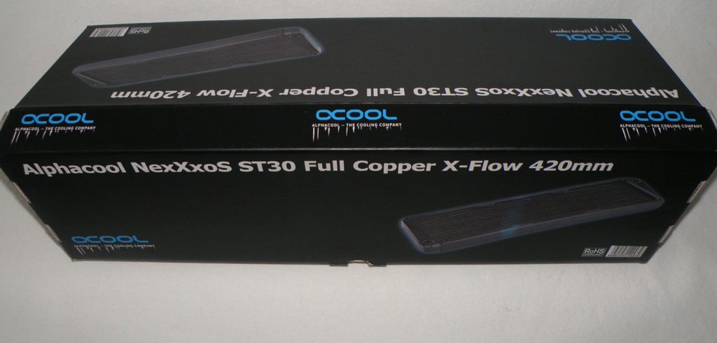 Der Alphacool NexXxoS ST30 Full Copper X-Flow 420 mm besitzt die Kennziffer ST30 und diese besagt, dass der Radiator nur 30 mm dick ist. Mit dieser Dicke passt er in fast jedes Gehäuse, welches einen Mount für Radiatoren anbietet. Die 25 mm der Lüfter müssen noch hinzugerechnet werden. Seitlich besitzt der matt schwarze Radiator einen OCOOL-Aufdruck. Das OC stellt ein Alphazeichen dar, welches in das C von Cool laufen soll, also Alphacool.