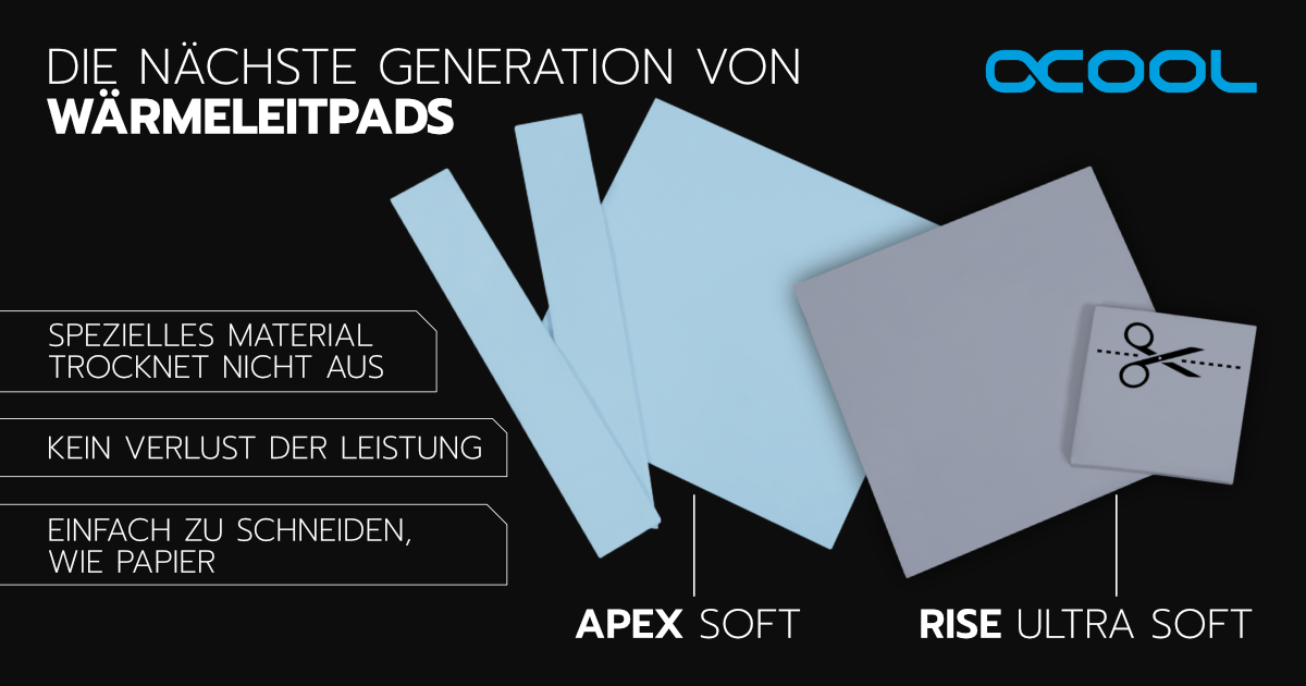 Alphacool präsentiert heute mit Apex Soft und Rise Ultra Soft eine neue Generation von Wärmeleitpads, die aufgrund ihrer herausragenden Eigenschaften mit dem Wirkungsgrad einer Wärmeleitpaste verglichen werden können.