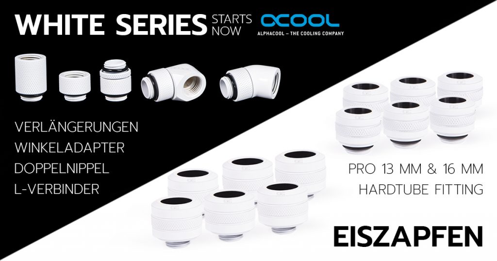 Alphacools bewährte Eiszapfen Anschlussserie ist ab sofort in der WHITE-SERIES-Edition erhältlich. Zusätzlich zu brillantem Chrome und tiefmattem Schwarz sind Alphacools Verlängerungen, Winkeladapter, Doppelnippel, L-Verbinder und Hardtube Fittings der Eiszapfen Serie jetzt auch in dezent edlem Weiss verfügbar. Dank spezieller Verfahren wird die Beschichtung fest mit dem Untergrund verbunden. Das sorgt für eine hohe Langlebigkeit der Farbe und verhindert ein Abplatzen der Beschichtung. Der Großteil der Anschlüsse verfügt zusätzlich über das Alphacool Logo, was sie neben Form und Farbe einfach unverwechselbar macht! Der weiße Eiszapfen erfüllt mit Highflow, Form, Verarbeitung und Farbgebung alle Anforderungen, die an einen Anschluss in High-End Ausführung gestellt werden.