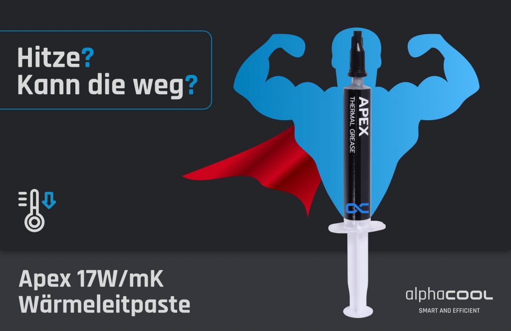 Alphacool stellt die neue Apex Wärmeleitpaste vor. Mit einer Wärmeleitfähigkeit von 17 W/mk reiht sich ein in den Kreis der leistungsstärksten Wärmeleitpasten auf dem Markt.