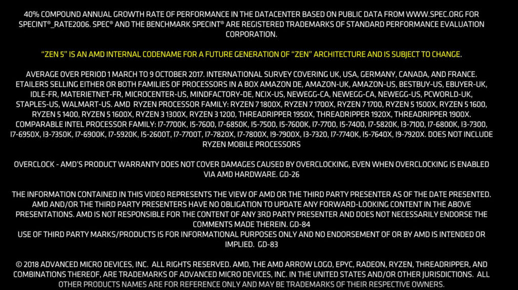 Andererseits bietet „Zen 2“ AMD die Möglichkeit, größere Designänderungen (z.B. „mehr als 4 Kerne pro CCX“) oder sogar Verbesserungen im Kern selbst vorzunehmen. „Zen 5“ ist damit die fünfte große Chance der Mikroarchitektur seit „Zen“, obwohl es verfrüht wäre, sie „6. Generation Ryzen“ zu nennen, da es zwischen „Zen +“ und „Zen 5“ mehrere „+“ Lücken geben könnte. Um sicherzustellen, dass Clarks Worte nicht für einen Versprecher gehalten werden, kommentierte AMD sogar „Ja, er sagte Zen 5, siehe Endnote“ und bestätigte in der Endnote, dass „Zen 5“ ein echter interner Codename für eine Mikroarchitektur ist, an der AMD arbeitet.