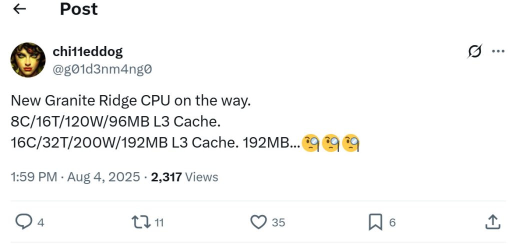 AMD steht offenbar kurz davor, seine Ryzen-9000-Serie („Granite Ridge“) mit zwei völlig neuen Zen-5-Prozessoren zu erweitern, die sowohl beim Stromverbrauch als auch beim Cache-Speicher neue Maßstäbe setzen. Laut dem renommierten Leaker chi11eddog, der enge Kontakte zu Mainboard-Herstellern pflegt, plant AMD die Einführung eines 8-Kern-/16-Thread-Modells mit einer TDP von 120 Watt und einem beeindruckenden L3-Cache von 96 MB. Dieser Wert entspricht der Cache-Dichte des bisherigen Ryzen 7 9800X3D, könnte jedoch eine eigenständige SKU darstellen.
