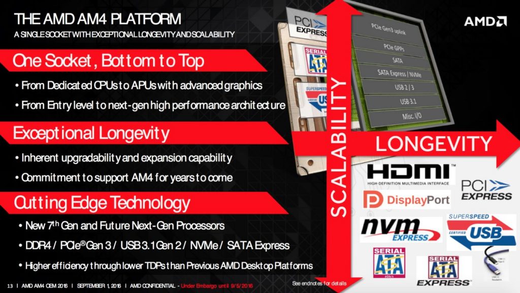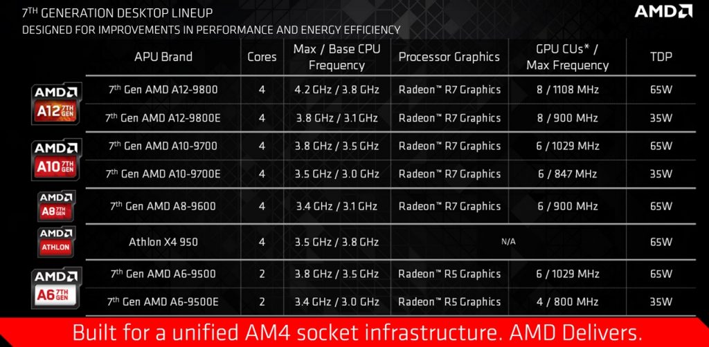 The AMD AM4 socket is a new unified socket infrastructure that provides compatibility between 7th Generation AMD A-Series processors and the upcoming high-performance “Summit Ridge” AMD desktop CPU. AM4 platforms feature DDR4 Memory and next-gen I/O and peripheral support, including PCIe® Gen 3, USB 3.1 Gen 2, NVMe, and SATA Express.