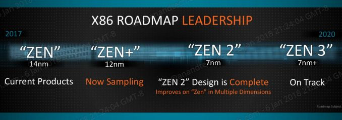 In Bezug auf AMDs 2020-Pläne gibt es einige sehr interessante Entwicklungen. Bei ihrem Tech-Day-Vortrag auf der CES hat AMD bestätigt, dass ihr Zen-2-Design auf dem 7-nm-Prozess bereits abgeschlossen ist. Das Fehlen von Zen 2-Erwähnungen in der Roadmap 2018 bedeutet, dass dieses spezielle Stück Silizium erst nach 2019 auf den Markt kommen wird. Aber das Unternehmen hat bereits angekündigt, dass das Design des Basisprozessors komplett ist – mit einigen tiefgreifenderen Änderungen als von Zen + Wir werden jetzt noch etwas Zeit haben, um das endgültige Design gemäß den Eigenschaften des 7-nm-Prozesses zu optimieren und zu aktualisieren. AMD hat auch angekündigt, dass ihr nächstes Update der Zen-Architektur, Zen 3 auf dem 7-nm + -Prozess, für 2020 (wahrscheinlich 4Q oder später) auf Kurs ist, was zu diesem Zeitpunkt wahrscheinlich bedeutet, dass das Unternehmen geplant hat, wie und wo sie mit weiteren Verbesserungen der Zen-Architektur weiter gehen wollen.