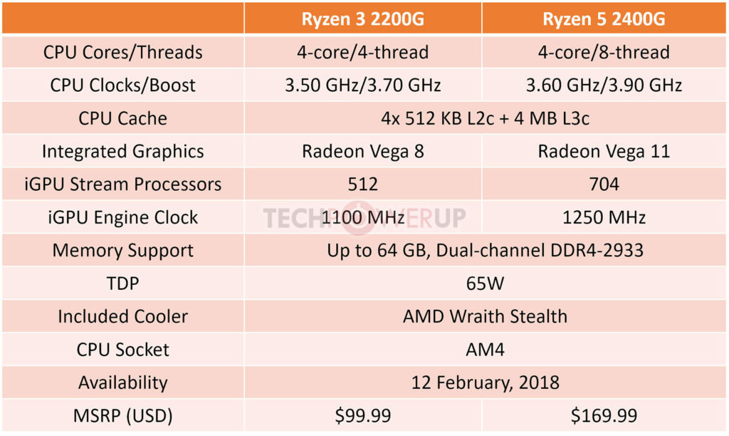 Der Ryzen 5 2400 verfügt über 4-Core/8-Threads, welche mit 3,60 GHz getaktet sind. Er besitzt eine Boost-Frequenz von 3,90 GHz, 2 MB L2-Cache (512 KB pro Kern) und 4 MB gemeinsam genutzten L3-Cache. Die Radeon Vega 11-Grafikeinheit besitzt 704 Stream-Prozessoren. Die iGPU Engine Clock ist auf 1250 MHz eingestellt. Der integrierte Dual-Channel-DDR4-Speichercontroller unterstützt bis zu 64 GB Dual-Channel-DDR4-2933-MHz-Speicher. Der Ryzen 3 2200G ist eine leicht abgespeckte Version. Ohne SMT tickt die 4-Core/4-Thread-CPU mit 3,50 GHz und 3,70 GHz Boost. Die iGPU verfügt nur über 8 von 11 NGCUs, was 512 Stream-Prozessoren entspricht. Der iGPU Engine Clock ist auf 1100 MHz eingestellt. Beide Komponenten verfügen über freigeschaltete CPU-Clock-Multiplikatoren, haben eine TDP-Bewertung von 65 W und werden AMD Wraith Stealth-Kühlungslösungen erhalten.