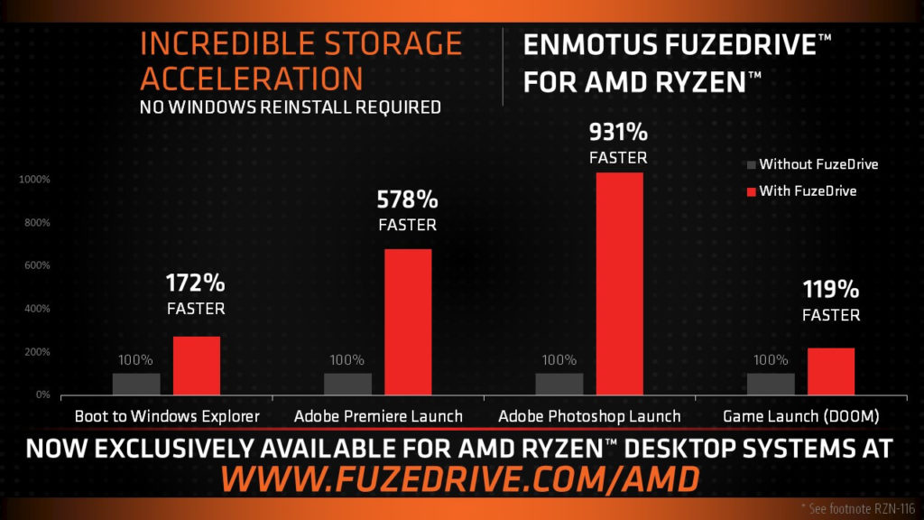 AMD arbeitete zusammen, um die FuzeDrive-Software von Enmotus für die Verwendung mit AMD Ryzen-Desktopprozessoren im Consumer-Desktop-PC-Bereich, für Systeme, die die Chipsätze AMD B350 und X370 (Sockel AM4 Ryzen 7, 5 und 3) und den X399-Chipsatz (Sockel sTR4 Ryzen Threadripper) verwenden, zu entwickeln.