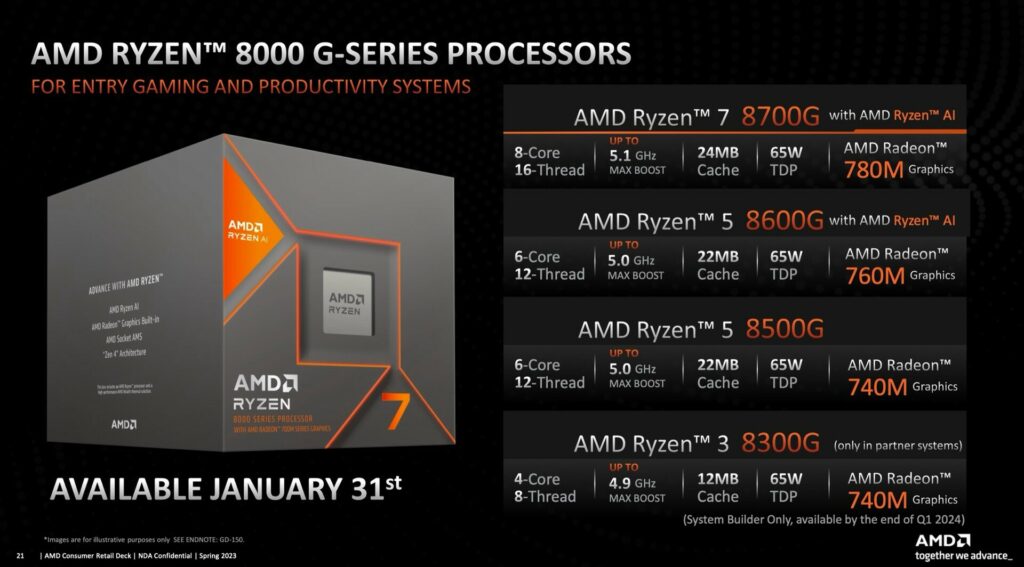 Die Desktop-Prozessoren der AMD Ryzen 8000G Serie bieten immense Leistung für Gamer und Kreative und sind die ersten x86-Desktop-Prozessoren mit einer NPU. Die AMD Ryzen™ 8000G Serie ist der ultimative All-in-One-Desktop-Prozessor. Ausgestattet mit bis zu acht Kernen und 16 Threads profitieren Benutzer von einer enormen Leistung und dominanten Performance für intensive Workloads wie Spiele und Content Creation erwarten. Diese Prozessoren sind für Effizienz optimiert und verbrauchen wenig Strom, ohne dabei an Leistung oder Reaktionsfähigkeit einzubüßen. Die Prozessoren der 8000G Serie basieren auf der AMD „Zen 4“-Architektur und ermöglichen eine führende Energieeffizienz bei gleichzeitiger Nutzung der unglaublichen Geschwindigkeit von „Zen 4“.