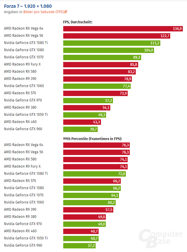 Das Testsystem bestand aus einem Intel Core i7-6850K (6 Kerne) mit 4,3 GHz, gepaart mit 16 GB DDR4-3000 Speicher im Quad-Modus und dem Crimson Relive 17.9.3/Geforce 385.69. Da hat die AMD Radeon Vega 64 doch wirklich, mit bis zu 23 % höheren FPS, die Nvidia GTX 1080 Ti im Forza 7 Benchmark besiegt. Schauen wir uns die GTX 1080 im Vergleich an, sehen wir das es sogar bis zu 3 2% sind. Die Werte wurden unabhängig von dem „In-Game-Benchmark“ ermittelt.