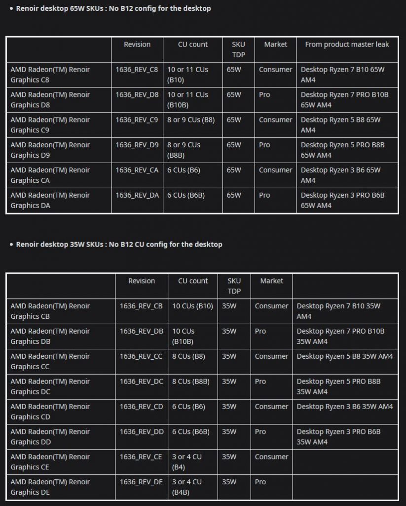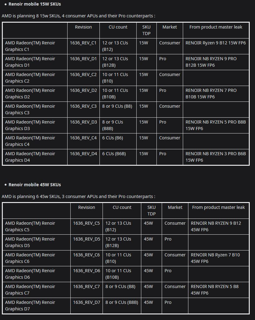 Der kommende „Renoir“-Chip von AMD wird das wichtigste Produkt des Unternehmens sein, da es nicht nur im Desktop-Bereich, sondern auch in Notebooks und ultraportablen Geräten eingesetzt wird. Ein Bericht von _rogame auf Reddit fasst die vielen iGPU-Varianten des Chips mit iGPU-Geräte-IDs zusammen und fügt sie in verschiedene Plattformvarianten ein. Renoir wird sich auf vier Schlüsselmarktsegmente konzentrieren, die durch TDP gekennzeichnet sind: 15 W Ultraportables, 45 W Mainstream-Notebooks, 65 W Mainstream-Desktops und 35 W Low-Power-Desktops.