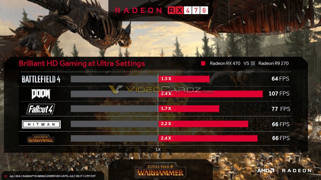 Die RX 470, basierend auf demselben „Ellesmere“ Chip wie die schon veröffentlichte RX 480, kommt mit 2048 Shadern und 32 GCN CUs, 128 TMUs, 32 ROPs und 4GB GDDR5 VRAM Speicher, der mit einem 256-bit Memory Interface angebunden ist.