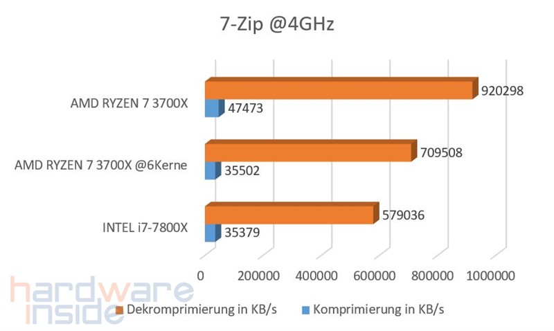 In der 7-Zip Dekomprimierung liegt AMD sehr gute 23 Prozent vorne und in Komprimierung nur magere 0,3 Prozent.