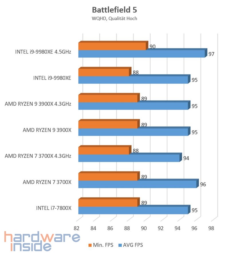 In WQHD rückt der i9-9980XE mit OC etwas an die Konkurrenz heran. In Battlefield 5 wird deutlich, dass hier der IPC-Vorteil von Zen2 nicht zum Tragen kommt.