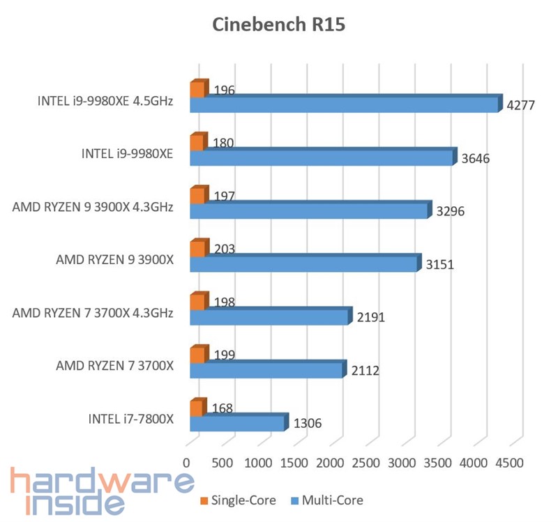 Als erstes schauen wir uns AMDs vorzeige Szenario an, Cinebench R15. Hier erreichen beide AMD RYZEN Prozessoren der 3. Generation ein sehr gutes Ergebnis. Mit OC steigt dieses nochmals an, allerdings nur beim Multi-Core Test. Das liegt vorallem daran, das der CPU-Takt mit OC bei Single-Core Anwendungen niedriger ist. Der RYZEN 7 3700X taktet im Single-Core Boost mit maximal 4375MHz und der RYZEN 9 3900X mit 4575MHz. Die Single-Core Leistung ist bei den neuen RYZEN Prozessoren deutlich angestiegen. So erreichten wir mit einem RYZEN 7 2700X mit OC auf 4.2GHz nur 174 Punkte. Die Mehrleistung bei Single-Core Anwendungen liegt nicht nur am höheren CPU-Takt sondern auch an der gestiegenen IPC-Leistung. Der RYZEN 9 3900X auf 4.3GHz übertaktet, liegt nur noch 400 Punkte von INTELs Core i9-9980XE entfernt. Wie bekannt ist, handelt es sich dabei um einen 18-Kerner und erreicht im Cinebench beim Multi-Core Test 3.6GHz. Im Single-Core ist der i9-9980XE den beiden RYZEN Prozessoren der 3. Generation unterlegen. Selbst mit OC auf 4.5GHz kommt das INTEL Flaggschiff nicht an den beiden AMD Prozessoren im Single-Core Test vorbei und muss sich hier geschlagen geben.