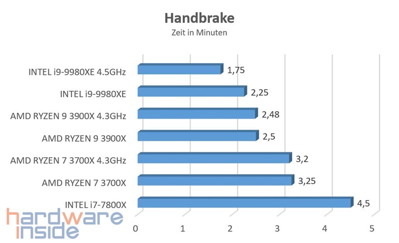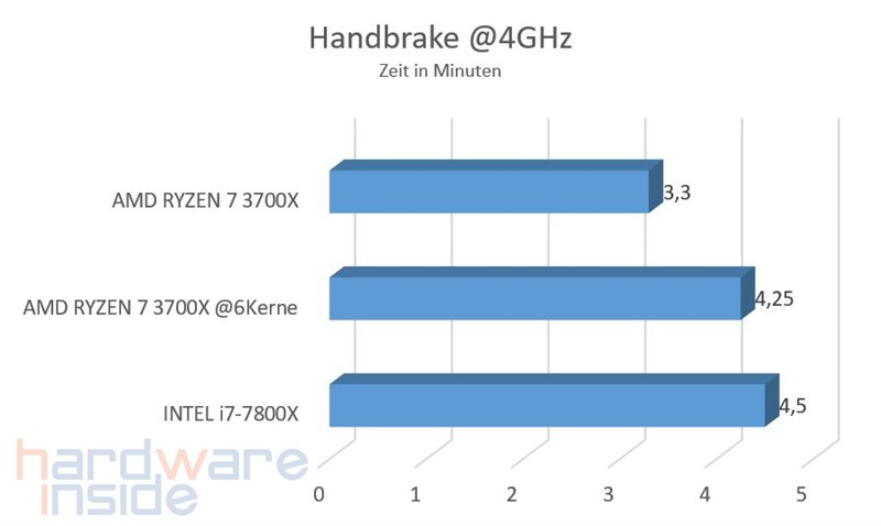 Nicht nur in den theoretischen Benchmarks liegt AMDs neuste Architektur vorne, sondern auch in der Praxis. In Handbrake liegt der Unterschied bei sechs Prozent.