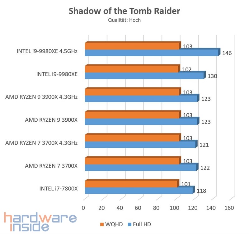 In Shadow of the Tomb Raider in Full HD kann die 3. Generation von AMDs RYZEN Prozessoren nicht so glänzen wie wir es uns wünschen würden. So liegt INTELs i9-9980XE vorne und mit OC deutlich vorne. In WQHD liegen alle Prozessoren gleich auf.