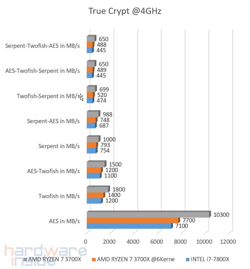 Auch bei TrueCrypt zeigt sich, dass Zen2 etwas schneller als die Skylake-X Architektur ist.
