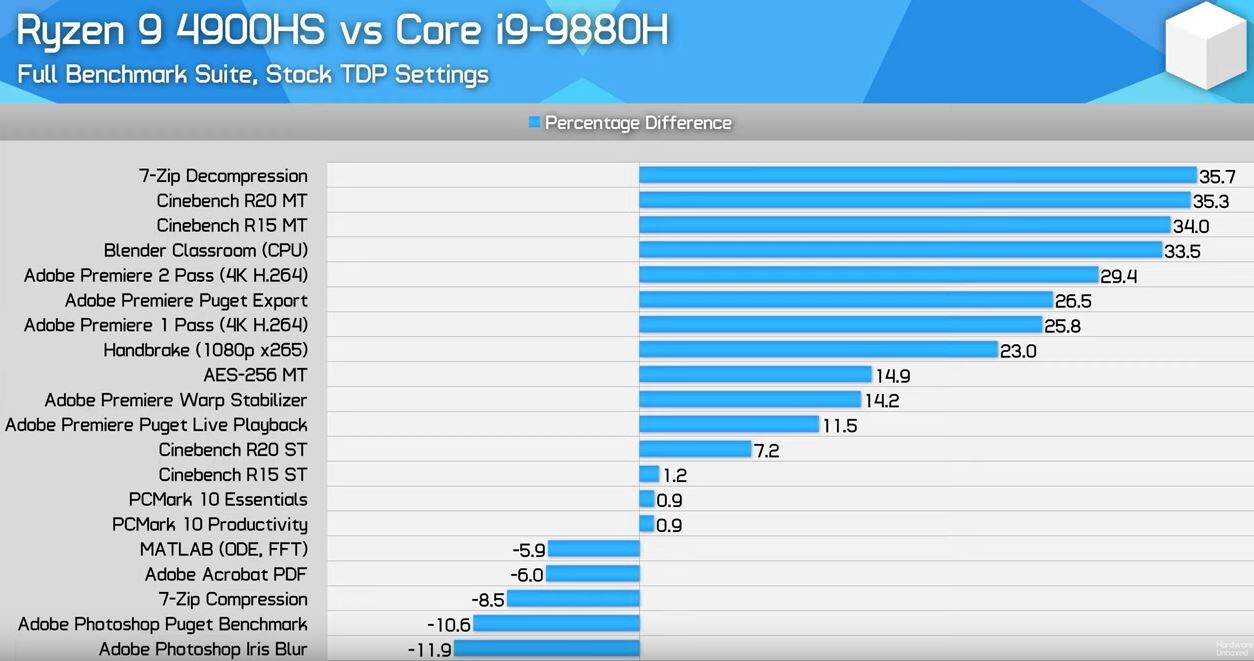 Der AMD RYZEN 9 4900HS weist einen 11,9% höheren CineBench R20-Wert auf (beide Chips sind 8-Core-/16-Thread-Chips), wenn der Intel-Chip mit 90 W cTDP ausgestattet ist, und eine satte 33% schnellere Leistung, wenn der i9-9980H auf die Standardeinstellungen eingestellt ist, und eine 54% schnellere Leistung, wenn er auf 35 W cTDP begrenzt ist. Außerdem ist er über 150% schneller als der letzte schnellste Mobilprozessor von AMD, der 12 nm „Picasso“-basierte Ryzen 7 3750H. Die Geschichte wiederholt sich mit dem CineBench R15 (4900H ist 34% schneller als der serienmäßige i9-9880H), 18% schneller bei der Handbrake HEVC, 25% schneller bei Blender „Classroom“ und 35% schneller beim 7-Zip Benchmark. Der AMD-Chip hinkt im weniger parallelisierten Photoshop um 12% hinterher. Bei Kreativitätsanwendungen, die mit Kernen skalieren, wie z.B. Premiere „Warp Stabilizer 4K“, ist der 4900HS 12,6% schneller. Die Leistung der Spiele bleibt eine gleichmäßige Verteilung zwischen den beiden Chips. Einige weitere interessante Testergebnisse und Kommentare finden Sie in der Präsentation Hardware Unboxed hier. Intel hat bereits eine Antwort auf den 4900HS in Form des i9-10980HK angekündigt.