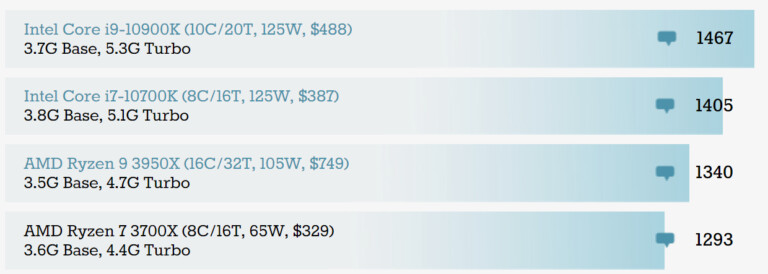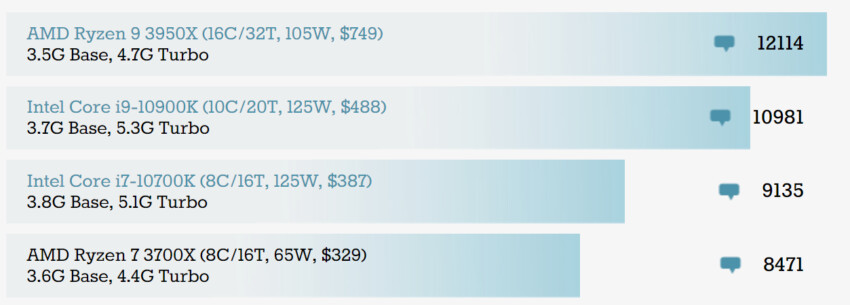 „Leaker extraordinaire“, TUM_APISAK, hat einige Benchmarks für AMDs kommende Ryzen 9 5900X und 5950X CPUs durchsickern lassen – nämlich in Geekbench 5. In dieser Runde von Leaks – die zugegebenermaßen von zwei verschiedenen Systemen stammen), erzielt der 12-Kern-AMD Ryzen 9 5900X mit 24 Threads 1605 Punkte in den Single-Core-Benchmarks und 12869 in den Multi-Core-Benchmarks. Der Ryzen 9 5950X mit 16 Kernen und 32 Threads erreicht dagegen 1575 Punkte bei Einzelkern- und 13605 Punkte bei Multi-Core-Workloads. Die höheren Basistakte des Ryzen 9 5900X sind möglicherweise für den höheren Single-Core-Score-Score verantwortlich; das Ryzen 9 5950X zieht jedoch – erwartungsgemäß – im Multi-Core-Teil des Benchmarks vor. Vergleicht man die Ergebnisse zwischen dem Zen 3 5950X und dem Zen-basierten 3950X (über AnandTech), die die gleiche Anzahl von Kernen aufweisen, so bietet das 5950X einen Vorteil von 18% bzw. 12% in den Single- und Multi-Threaded-Tests – nicht weit entfernt von AMDs angekündigtem 19%igen IPC-Anstieg.
