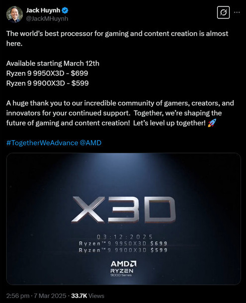 Heute bestätigte AMD die endgültigen Preise und das Einführungsdatum für die beiden neuen Ryzen 9000X3D-Prozessoren. Der Ryzen 9 9950X3D mit sechzehn Kernen und der Ryzen 9 9900X3D mit zwölf Kernen wurden Anfang Januar auf der CES 2025 offiziell enthüllt. Seitdem sind viele Leaks online aufgetaucht – einige Leaker lagen mit ihren Vorhersagen goldrichtig. Vor fast einem Monat wurden spekulative Preise von 699 $ und 599 $ bekannt.
