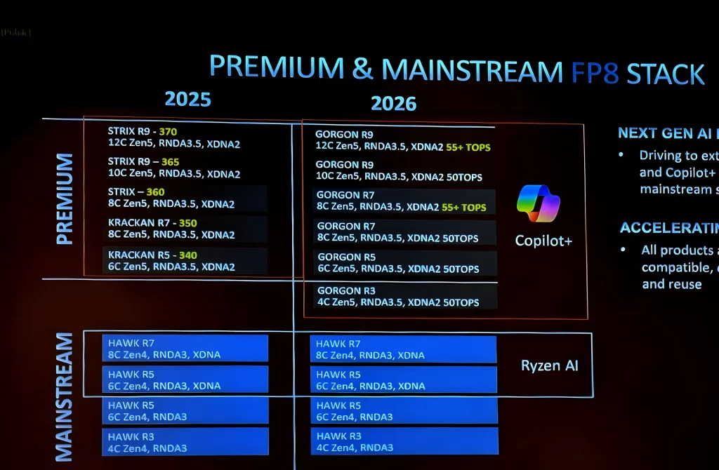 | Ryzen AI 400 | Gorgon Point | Zen 5 “Nirvana” + Zen 5c “Prometheus” | RDNA 3.5 (GFX115X) | FP8 | 25 × 40 | 2026 |