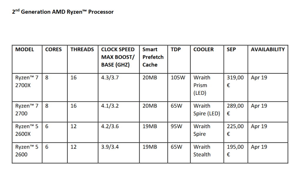 Die zweite Generation Ryzen Desktop-Prozessoren umfasst zwei 8-Kern, 16-Thread-Modelle und zwei 6-Kern, 12-Thread-Modelle. Folgende Versionen sind ab heute weltweit erhältlich: Ryzen™ 7 2700X, Ryzen™ 7 2700, Ryzen™ 5 2600X, and Ryzen™ 5 2600.