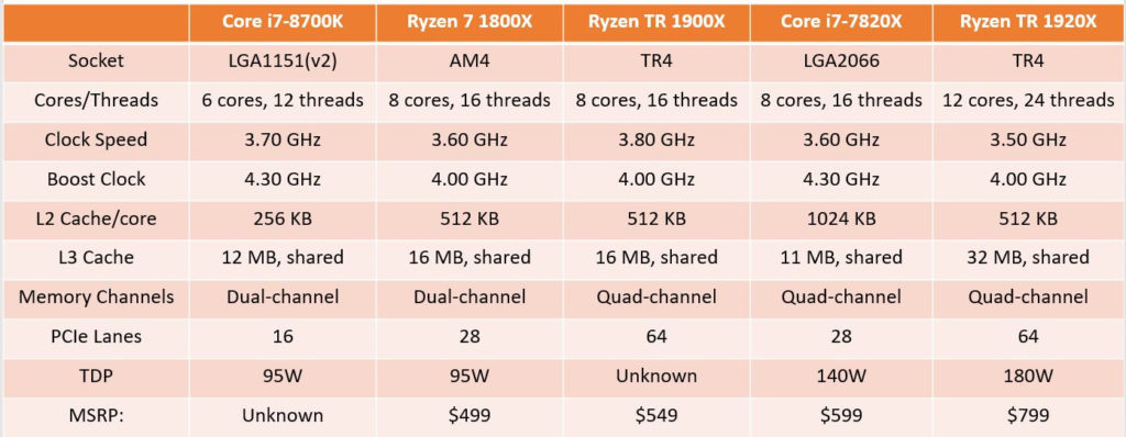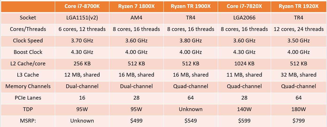 Laut primeABGB Liste, wird der 8-Kern/16-Thread Threadripper 1900X , im Gegensatz zu den beiden größeren Brüdern mit 32 MB L3 Cache, mit 16 MB L3 Cache arbeiten. Das deutet darauf hin, dass AMD hier die zwei „Summit Ridge“ DIEs im 1900X als eine 2+2+2+2 CCX Konfiguration, mit je 4 MB L3 Cache, laufen lässt. Ähnlich einem Ryzen 1400. Der Chip arbeitet mit einem Quad-Channel DDR4 Arbeitsspeicherinterface und 64 PCIe Lanes. Preislich angesiedelt zwischen dem Intel Core i7-7800X und dem i7-7820X muss er sich gegen diese beiden behaupten. Zu der TDP des Threadripper 1900X gibt es noch keine Angaben, wir vermuten aber das diese ähnlich der 140 Watt von dem Intel Core i7-7820X ausfallen wird.