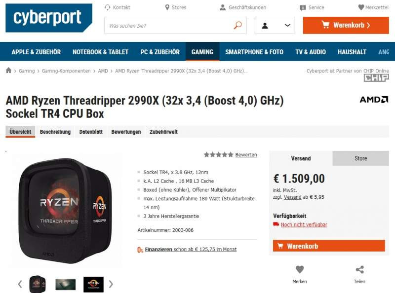 Quelle: AMD Ryzen Threadripper 2990X 32-core CPU Listed for €1509