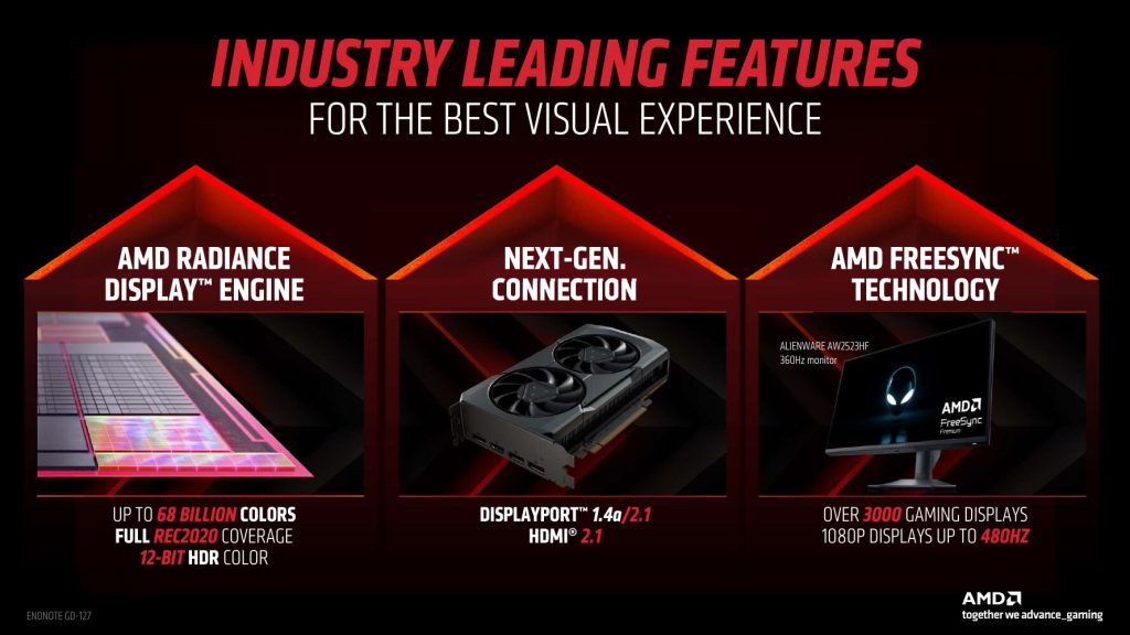 - AMD Radiance Display Engine: Bietet Unterstützung für DisplayPort 2.1 bei ausgewählten Modellen und HDMI 2.1a-Displays für ultrahohe Auflösungen und hohe Bildwiederholraten für Spiele und die Erstellung von Inhalten.