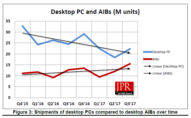 Der GPU- und der PC-Markt zeigen eine Rückkehr zur normalen Saisonalität. Dieses Muster ist im ersten Quartal typischerweise flach bis sinkend, ein deutlicher Rückgang im 2. Quartal, da die OEMs und der Vertrieb vor den Sommermonaten die Lagerbestände aufgebraucht haben. Eine Aufstockung mit den neuesten Produkten im 3. Quartal in Erwartung der Weihnachtszeit und ein leichter Anstieg auf eine flache Veränderung im vierten Quartal. All dies hat zu einem allgemeinen Rückgang des PC-Marktes seit der großen Rezession von 2007 und dem Zuzug von Tablets und Smartphones geführt. In diesem Jahr waren die AIB-Sendungen aufgrund der neuen Spiele und des Kryptowährungs-Mining jedoch nicht mehr synchron. “