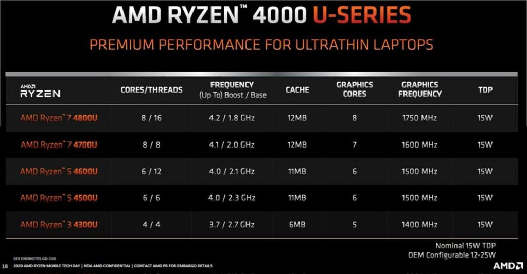 Zumindest scheint das bei einigen der ultradünnen und leichten Laptop-Optionen der Fall zu sein, die mit der Rzyen 4000 U-Serie von AMD betrieben werden. Bei diesen Chips handelt es sich im Grunde um mobile APUs mit vier bis acht Kernen (und bis zu 16 Threads), 6 MB bis 12 MB L3-Cache und bis zu acht Grafikkernen, die auf AMDs Vega-GPU-Architektur basieren.