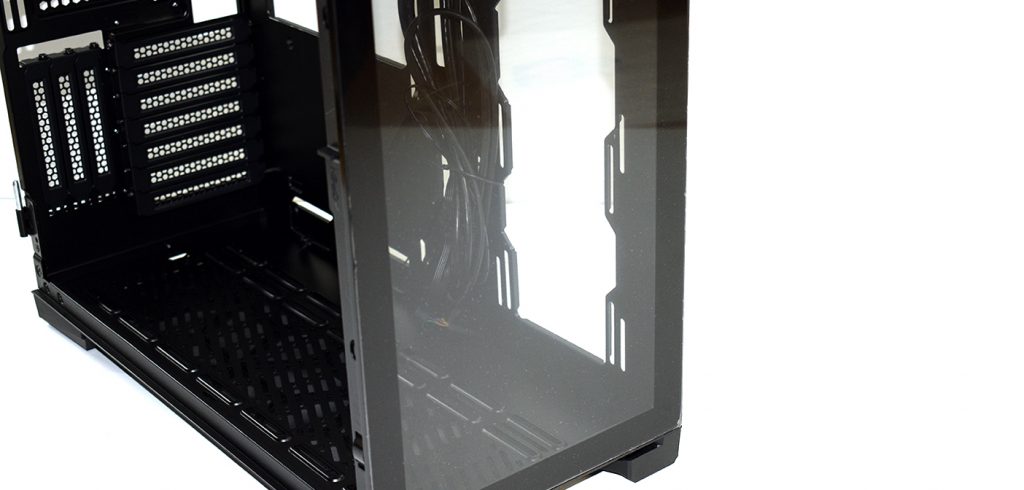 Auch die Unterseite kann sich sehen lassen. Das Antec P120 Crystal bietet im Boden den Platz für einen gewaltigen Radiator samt Lüfter. Die Fläche ist großzügig gestaltet und ohne Hindernisse zu bestücken. Links an den Slotblenden kann auch eine Grafikkarte hochkant aufgestellt werden. Die Verarbeitung ist im Gesamten sehr hochwertig. Für die Lüfter sind im unteren Teil des Mainboardtrays zwei Öffnungen eingelassen.