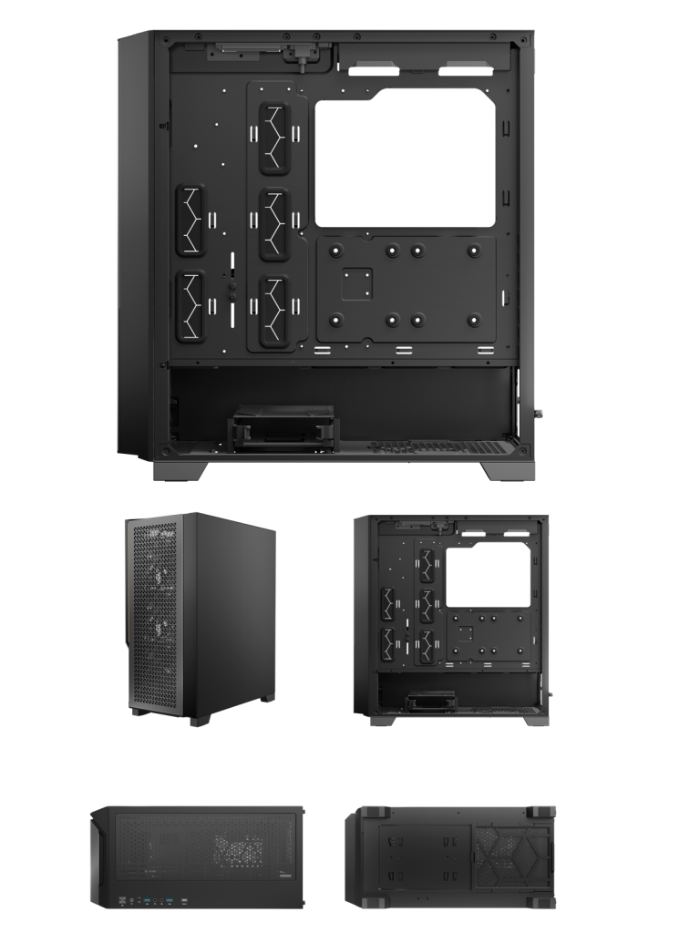Das Gehäuse verfügt über zwei werkzeuglos konvertierbare 3,5-Zoll-Festplattenlaufwerkskäfige (konvertierbar auf 2x 2,5-Zoll-SSDs), zwei 2,5-Zoll-SSD-Einbauplätze sowie sieben Erweiterungssteckplätze.