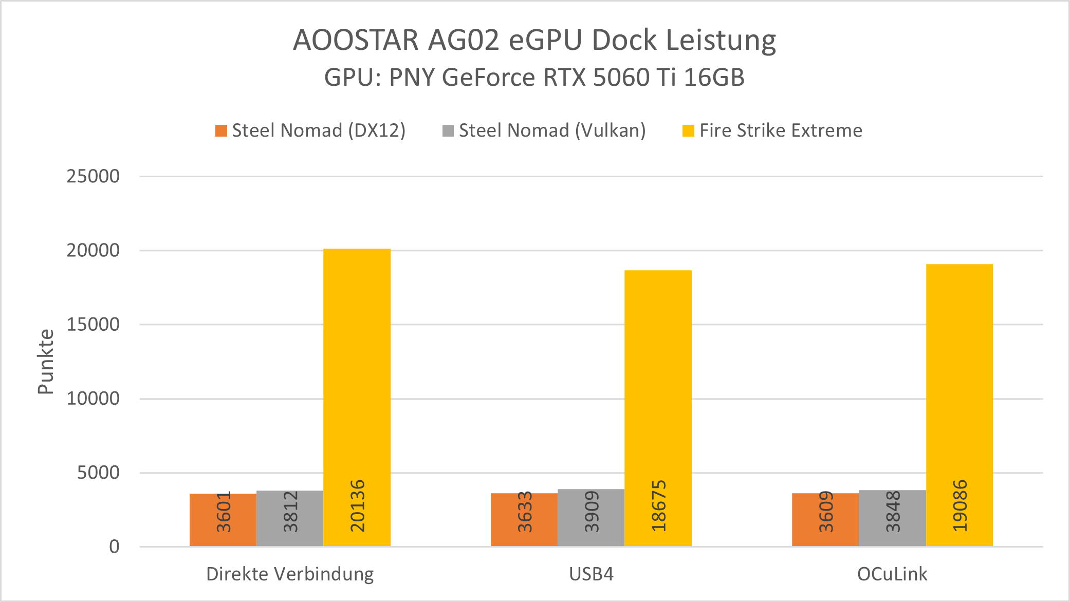 Da die USB4-Schnittstelle ebenfalls eine Anbindung über PCIe 4.0 x4 bietet, sind die Ergebnisse im Vergleich zur OCuLink-Anbindung sehr ähnlich. Im „Steel Nomad“-Test liegt die USB4-Verbindung leicht vorne, im älteren „Fire Strike Extreme“ hat die OCuLink-Schnittstelle die Nase vorne. Wir bevorzugen daher die USB4-Verbindung, da diese zusätzlich Power Delivery bietet, hotplugfähig ist und sich somit deutlich einfacher handhaben lässt.