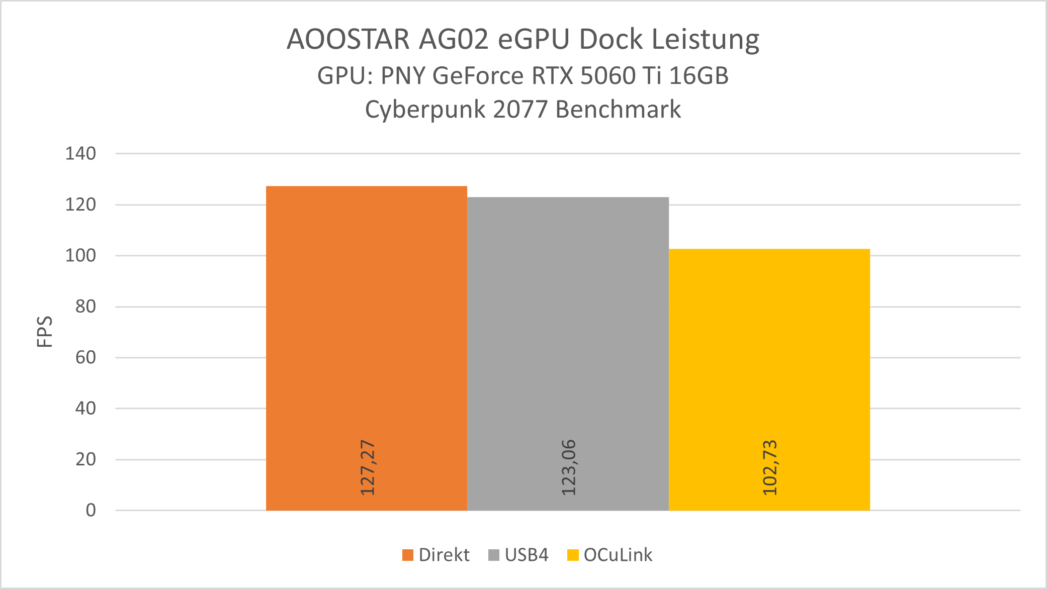 Die Nutzung des OCuLink-Interfaces führte bei der Bildrate des Cyberpunk-2077-Benchmarks zu einer deutlichen Verminderung. Wir vermuten, dass der verwendete PCIe-zu-OCuLink-Adapter hier auch eine Rolle spielt. Über USB4 und bei direkter Verbindung der Grafikkarte erreichten wir über 120 FPS, also etwa 4 FPS mehr als bei der Verbindung über die USB4-Schnittstelle. Auch hier zeigt sich, dass wir mit dem AOOSTAR AG02 eGPU Dock nur eine geringe Leistungseinschränkung feststellen können.
