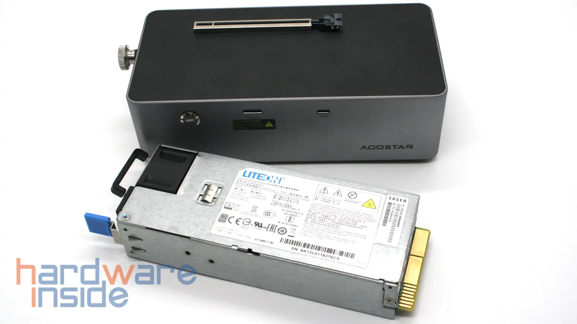 Eine Besonderheit des Docks ist das 800 W starke Netzteil, mit dem Grafikkarten und das verbundene PC-System per Power-Delivery mit Strom versorgt werden können. Bei dem Netzteil handelt es sich um ein flaches Server-Netzteil, das rückseitig in das Dock eingeschoben ist und sich mit einem Hebel entriegeln und dann aus dem Dock herausziehen lässt. Bei dem Netzteil handelt es sich um ein Lite-on PS-2801-12L mit 800 W Nennleitung und einer 80PLUS Platinum Zertifizierung mit einer durchschnittlichen Effizienz von 91,9 % (Quelle: 80Plus Zertifizierung). Es ist mit dem Dock über eine Edge-Connector-Schnittstelle (HP Common Slot) verbunden. Ein Austausch oder gar Upgrade des Netzteils ist somit leicht möglich, sofern das Austauschmodell die gleichen Maße und die gleiche Schnittstelle bietet.