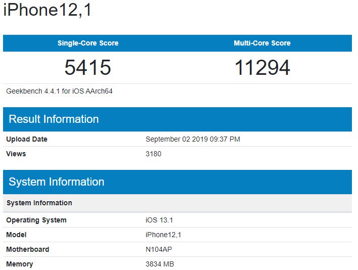Das Modell ist als „iPhone12,1“ unter iOS 13.1 und „N104AP“ als Motherboard aufgeführt. Dieser letztgenannte Bezeichner steht im Einklang mit früheren Gerüchten, wonach der Nachfolger des iPhone XR (Teil der iPhone 11 Serie) unter dem Codenamen N104 geführt wird.