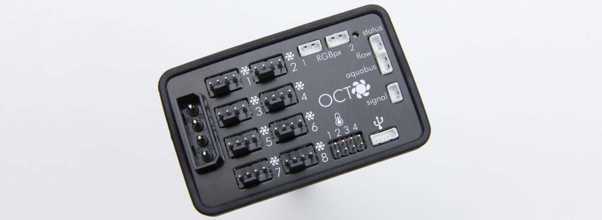 An der Stelle sollte bedacht werden, dass sich das OCTO ausschließlich für PWM-ansteuerbare Lüfter eignet, da eine Steuerung über Spannung weitere Bauteile erfordert. Ein aquaero bietet diese Möglichkeit, kostet aber auch mehr und nimmt deutlich mehr Platz in Anspruch. Sollte die maximal bereitgestellte Leistung nicht ausreichen, kann die Platine jederzeit mit zusätzlichen kleineren Platinen erweitert werden, welche wiederum auf eine eigene Stromversorgung setzen – wie das Aqua Computer Splitty.