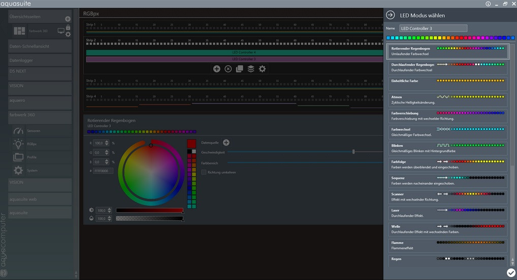 Damit dies alles einfach zu bedienen ist, hat Aqua Computer in die aquasuite Software viel Arbeit investiert und einen neuen Meilenstein für RGB-Controller gesetzt. Wie in einem Video-Schnittprogramm können Regler per Drag & Drop auf Strips gelegt, verschoben, kopiert und sogar geklont werden. Absolut intuitiv können Effekte miteinander kombiniert und Profile angelegt werden. Aqua Computer ist sehr stolz auf die einfache Bedienung!