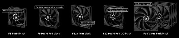 Mit den Produktvarianten F8 PWM Black, F9 PWM PST Black, F12 Silent Black, F12 PWM PST CO Black und dem F14 Value Pack Black sind einige der meistverkauften Standardlüfter nun auch in schwarz erhältlich. „Mit der Produktion der schwarzen Zusatzmodelle kommen wir dem Wunsch unserer Kunden nach schlichten, klassisch designten PC-Lüftern nach,“ so Vincent Andre, Technischer Direktor bei ARCTIC. Die Produkte sind ab sofort im ARCTIC Webshop, bei Amazon und im Handel zu finden.