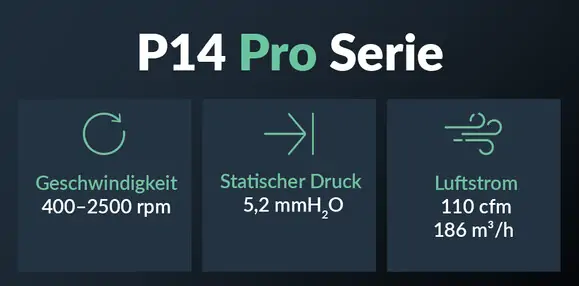 Die P14 Pro-Lüfter überzeugen ebenfalls mit einer neuen Controller-Motor-Einheit. Sie senkt Betriebsgeräusche spürbar und gleicht Drehzahlschwankungen bei erhöhtem Widerstand automatisch aus. Integrierte Schutzmechanismen reduzieren Einschaltstromspitzen und bieten zuverlässigen Schutz vor Verpolung.
