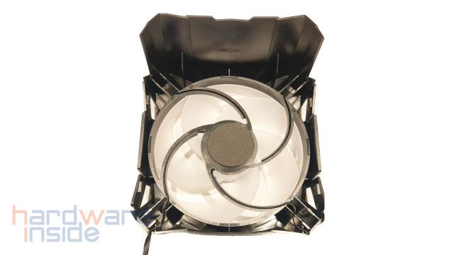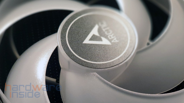 ARCTIC setzt bei der Wärmeabfuhr auf einen 112 mm Lüfter. Dieser befindet sich in einer schwarzen Kunststoffhalterung. Dadurch ist es nicht möglich, einen anderen Lüfter zu verwenden. Der aus einem milchig-durchscheinenden Kunststoff gefertigte Impeller besitzt ein fünfblättriges Design. Die Lüfterblätter sind lang gezogen und sehr breit. Auf der Lüfternabe ist ein runder Aufkleber mit dem ARCTIC-Logo angebracht. Im Betrieb wird der Impeller durch 12 ARGB LEDs in der Lüfternabe beleuchtet.