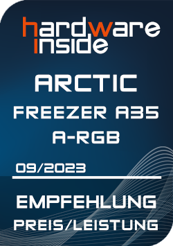 Der ARCTIC A35 A-RGB ist derzeitig für knapp 26 € im Preisvergleich gelistet und befindet sich damit im unteren Preis-Segment. Dafür bekommt der Käufer einen einfach zu montierenden, gut verarbeiteten Tower-Kühler mit einer soliden Kühlleistung. Auch an die RGB-Fans wurde mit dem beleuchteten Lüfter gedacht. Etwas ungewöhnlich ist die Lüftergröße und fehlende Möglichkeit des Lüftertauschs. Aber trotzdem kann der ARCTIC A35 A-RGB auf ganzer Linie mit seiner gebrachten Leistung überzeugen und bekommt dafür unseren Preis-/Leistungsaward.