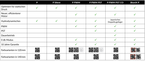 Die P-Lüfter erreichen Drehzahlen bis zu 2100 U/Min und zeichnen sich dabei durch das kaum wahrnehmbare Betriebsgeräusch und niedrigste Kommutationsschwingungen aus. Die Lüftergeschwindigkeit lässt sich mittels PWM stufenlos steuern – bei einem PWM-Signal unter 5 % wechseln die Lüfter dank des neuen Motors automatisch in einen lautlosen Passivmodus.