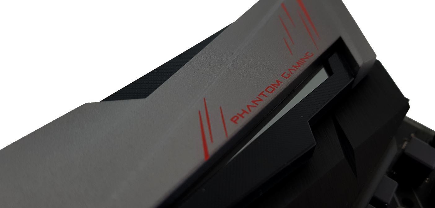 Rechts neben den Bänken für den Arbeitsspeicher ist der Anschluss für adressierbare RGB LED zu finden. Bei der näheren Betrachtung sticht das PCB Design ins Auge. Das PCB selbst ist komplett schwarz mit einem grau/roten Design. Der „Phantom Gaming“-Schriftzug auf der rechten Seite des Mainboards ist leicht gelblich, was aber daran liegt, dass dieser Bereich im Betrieb durch RGB LEDs ausgeleuchtet wird.
